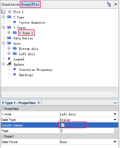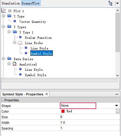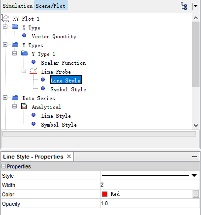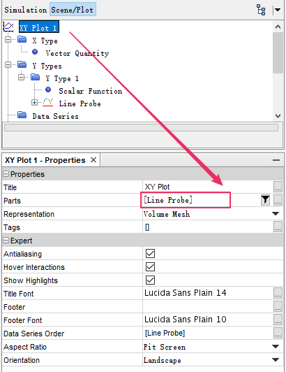 如下图所示,选中模型树节点XY Plot 1,属性窗口选择Parts为Line Probe