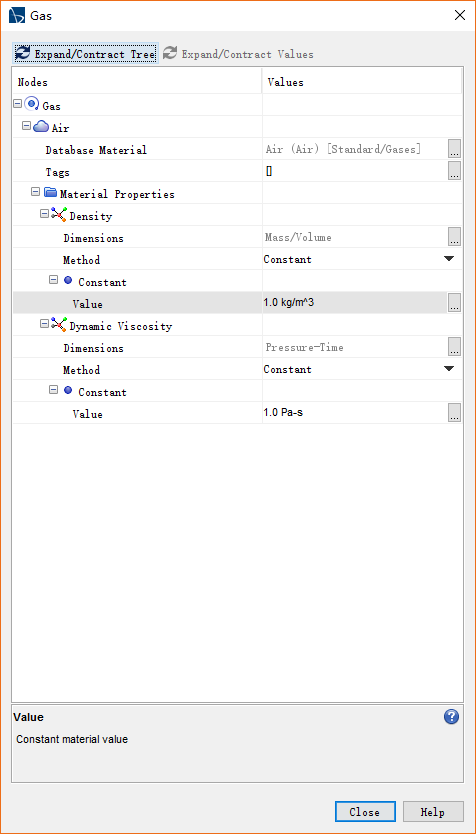 鼠标双击模型树节点Continua > Physics 1 > Models > Gas > Air,弹出材料属性设置对话框,如下图所示,设置密度为1 kg/m3,粘度为1e-5 Pa-s