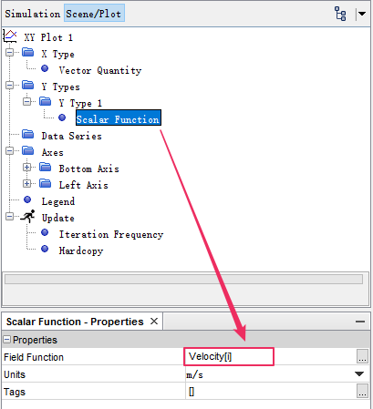 选择节点Scalar Function,属性窗口设置Field Function为Velocity[i],显示X方向速度
