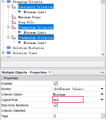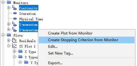 如下图所示,同时选中模型树节点Continuity、X-momentum、Y-momentum,点击鼠标右键,选择菜单项Create Stopping Criterion from Monitor