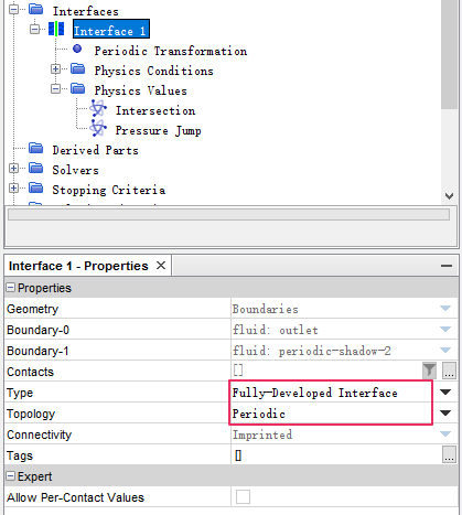 点击模型树节点Interface 1,属性窗口中设置Type为Fully-Developed Interface,设置Topology为Periodic
