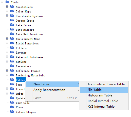 右键选择模型树节点Tools > Tables,点击菜单项New Table > File Table创建表格,在弹出的文件选择对话框中选择文件Analytical.csv