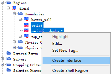同时选择边界outlet及periodic-shadow-2,点击鼠标右键,选择弹出菜单项Create Interface创建交界面