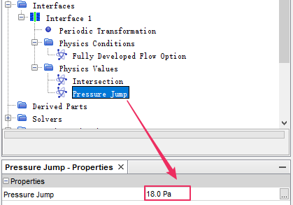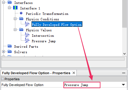 选中模型树节点Interface 1 > Physics Conditions > Fully Developed Flow Option,属性窗口中设置选项为Pressure Jump
