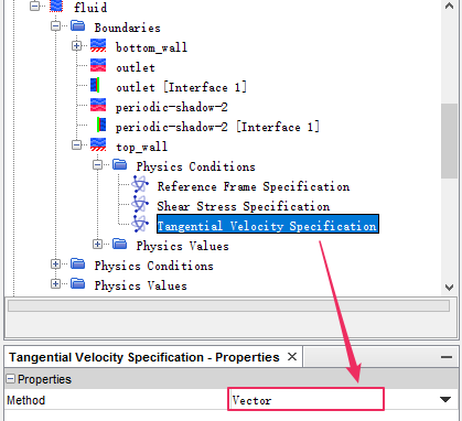 鼠标点击模型树节点Region > FLUID > Boundaries > top_wall > Physics Conditions > Tangential Velocity Specification,属性窗口中设置Method为Vector