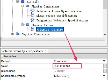 模型树节点top_wall > Physics Values > Relative Velocity,属性窗口设置Value为[3 0] m/s,表示其速度为x方向3 m/s