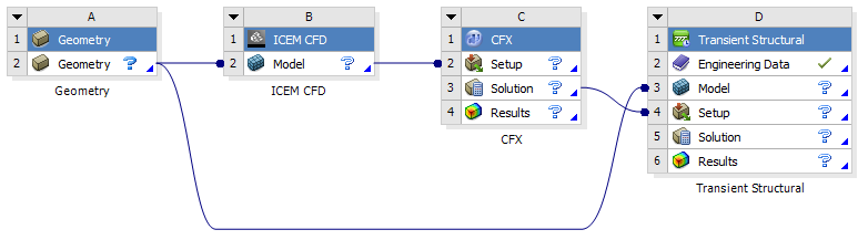利用CFX与Transient Structural耦合计算,不需要采用System Coupling进行数据转发。然而CFX的网格处理能力有限,通常不适合大变形情况的计算。