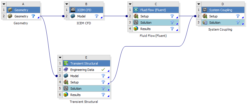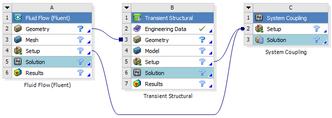 流固耦合计算由于同时涉及到固体求解器与流体求解器,因此需要考虑数据同步问题。在ANSYS Workbench中,数据同步工作是由System Coupling来完成的。