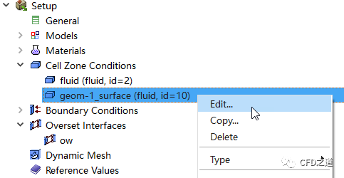 右键选择模型树节点Cell Zone Conditions > geom-1_surface,点击弹出菜单项Edit...