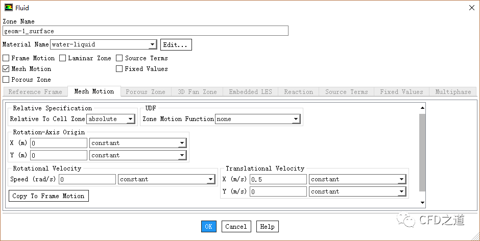 激活选项Mesh Motion,设置X方向速度0.5 m/s
