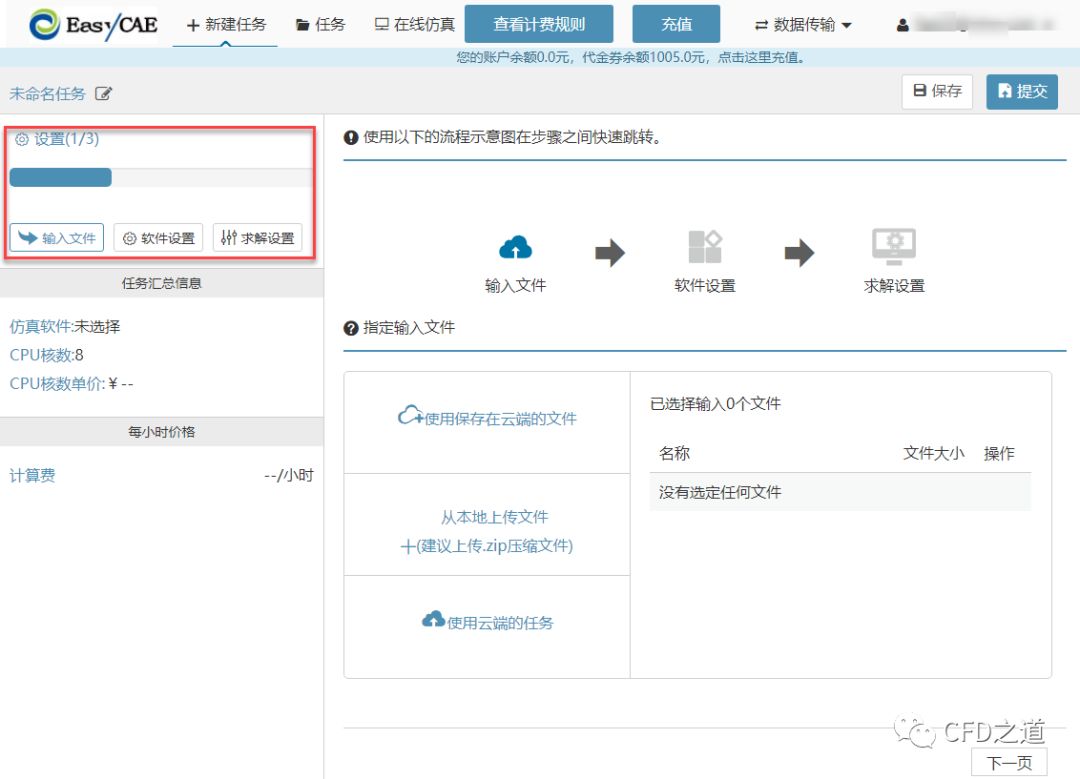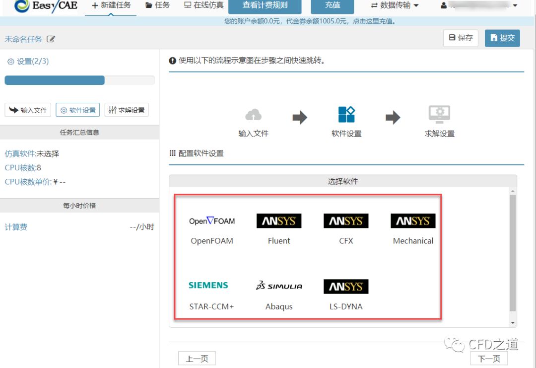 看界面是要先输入文件,再进行软件设置(下图中红色框位置)。不过到目前为止我还没有选择软件,那输入什么文件呢?按道理来说输入的文件应该跟选择的软件求解器有关才对,按正常逻辑来讲应该是先选择求解器,再上传输入文件。这地方UI设计有问题。