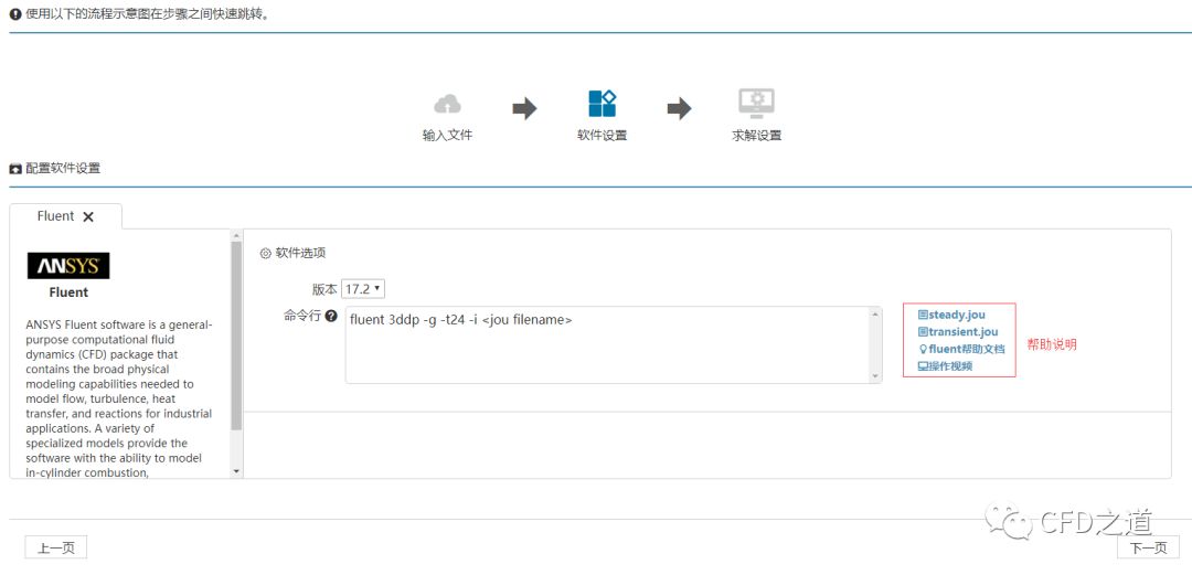 点击Fluent按钮进入Fluent设置。如下图所示,查看帮助说明文件,知道需要输入jou文件与cas文件。