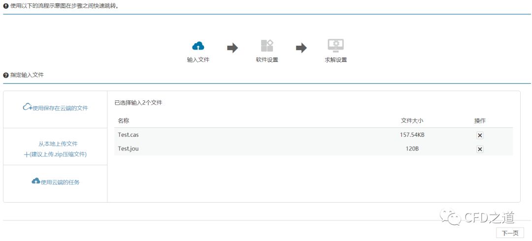 点击上一页进入文件上传界面,上传文件Test.cas及Test.jou。