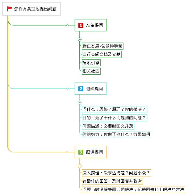 用3个月时间来尝试,如果达不到要求,就解散这个群。最终的目标:群里所有人员学历硕士研究生以上(不包括在校学生),群内杜绝单方面提问,采用下面的步骤探讨问题(这个图在网络上流传甚广,我这里在Mindjet MindManager 2018中重新绘制并借用一下,在此对原作者表示感谢)。