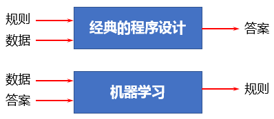 图灵的这一问题引出了一种新的编程范式。在经典的程序设计中,人们输入规则和需要根据这些规则进行处理的数据,系统输出的是答案(如下图所示)。利用机器学习,人们输入的是数据和从这些数据中预期得到的答案,系统输出的是规则,这些规则随后可以应用于新的数据,并使计算机自主得到答案。