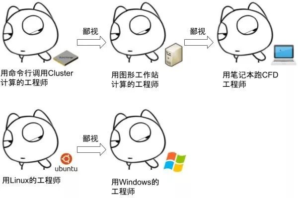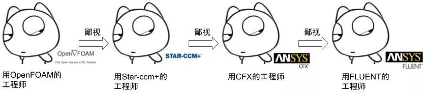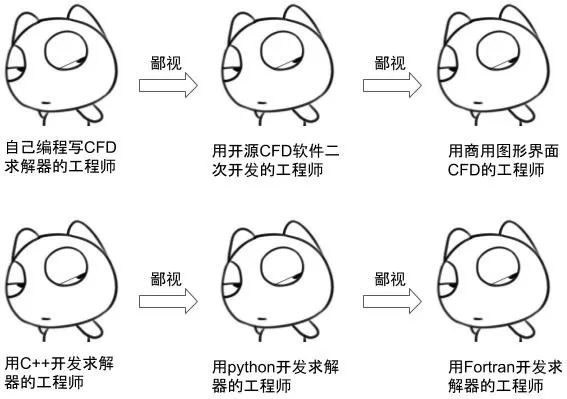 CFD编程是少数人能做的事情,用开源二次开发难度要小一些,而用商业软件几乎不需要编程。于是下面的鄙视就出来了。