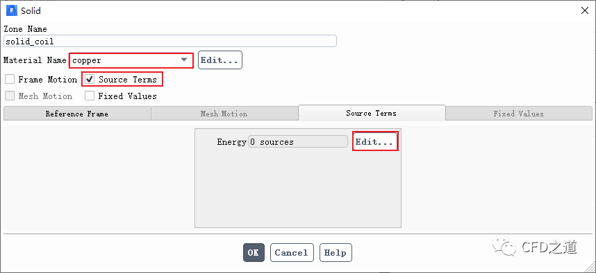 设置固体区solid_coil的材料类型为copper,激活选项Source Terms,如下图所示进入源项标签页,点击Edit…按钮