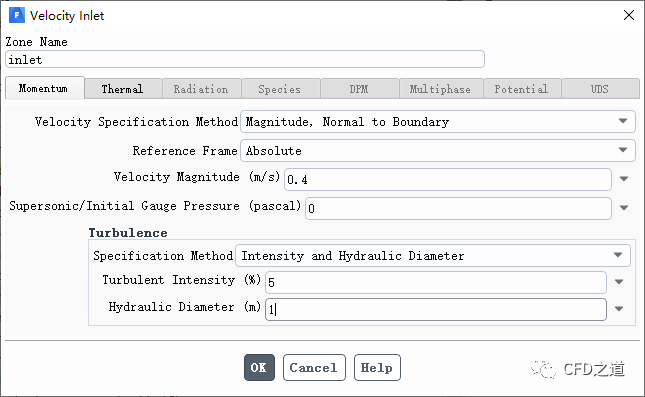 设置流体入口inlet的流速为0.4 m/s