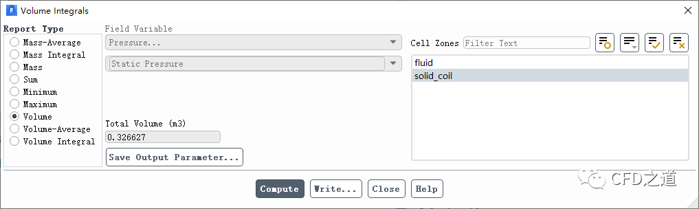 查看固体区域体积,如下图所示为0.326627 m3,并非前面估计的0.3 m3