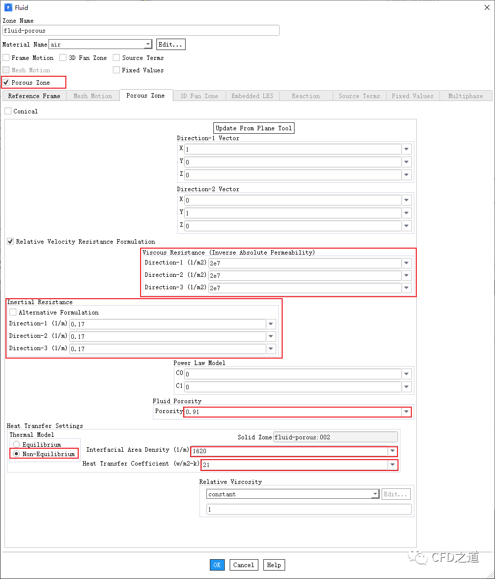 设置区域fluid-porous为多孔介质,并指定多孔介质参数,如下图所示