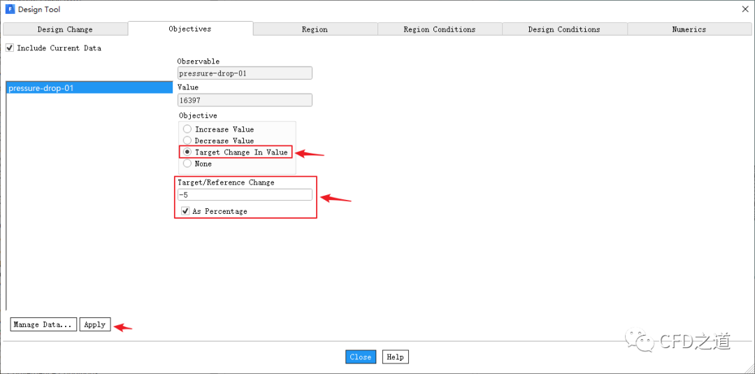进入Objectives标签页,如下图所示选中列表项pressure-drop-01,激活选项Target Change In Value,设置Target/Reference Change为-5,激活选项As Percentage,点击按钮Apply
