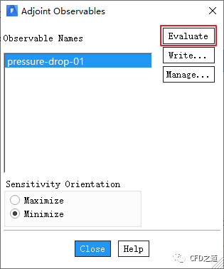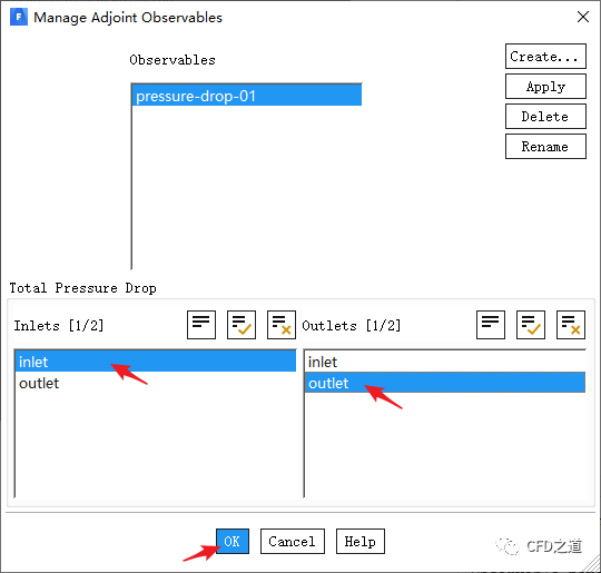 如下图所示选择用于计算压降的进出口边界,点击按钮Apply创建目标,并点击OK按钮关闭对话框