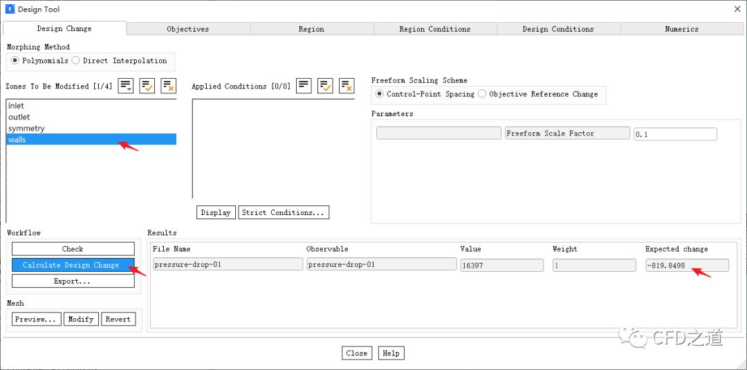 进入Design Change标签页,点击按钮Calculate Design Change,此时可以看到目标变化值为-819.8498 Pa