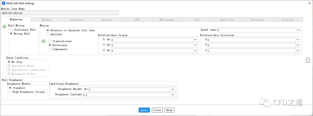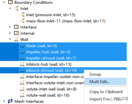 如图所示选择边界blade、impeller-hub、impeller-shroud、inblock-shroud,点击菜单项Multi Edit…
