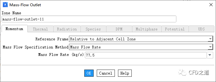 修改边界mass-flow-inlet-11 类型为mass-flow-outlet,指定质量流量为77.5 kg/s
