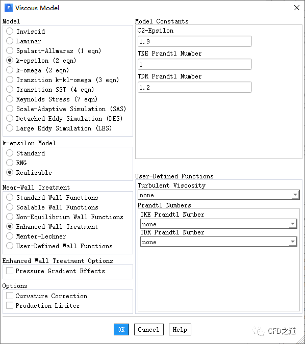 选择使用Realizable k-epsilon湍流模型,激活Enhanced Wall Treatment壁面处理