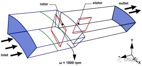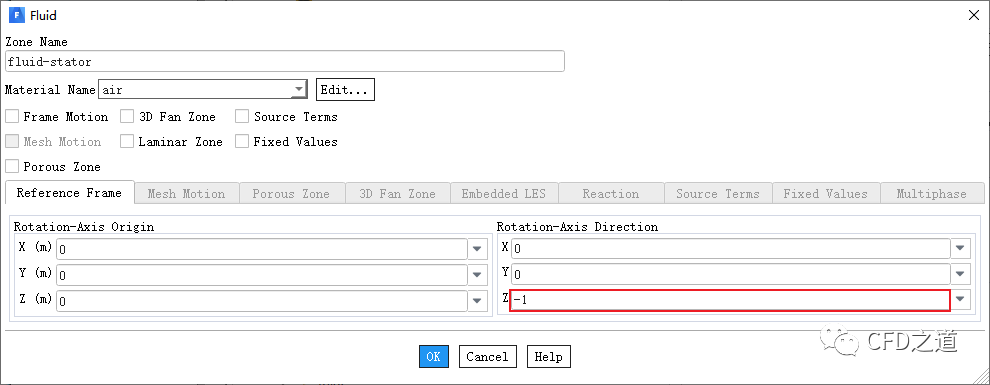 设置旋转区域fluid-rotor旋转速度为1800 rpm,旋转方向为z轴负方向