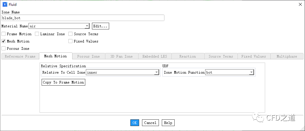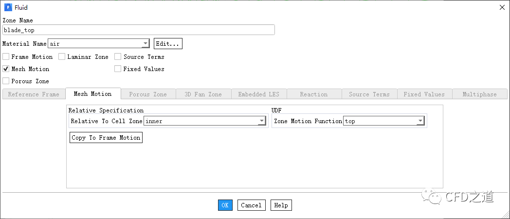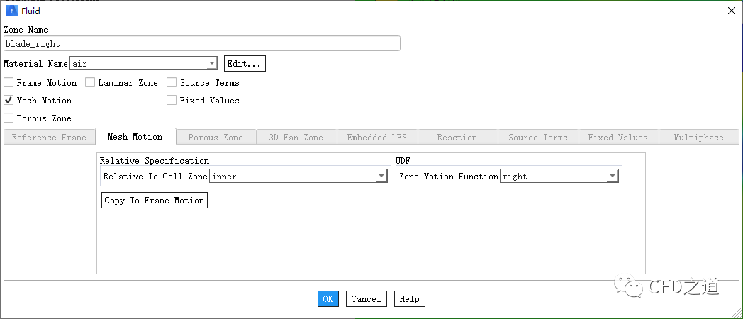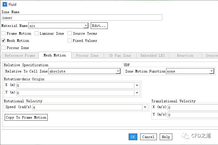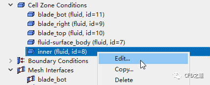 右键选择模型树节点Cell Zone Conditions > inner,点击弹出菜单项Edit...,打开设置对话框