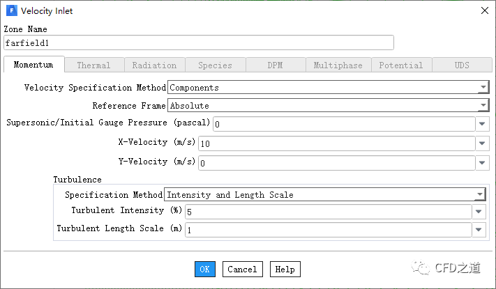 右键选择模型树节点Boundary Conditions > farfield1,点击弹出菜单项Type → velocity-inlet,弹出参数设置对话框 -