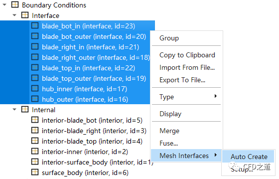 选择模型树节点Interface下的所有子节点,点击鼠标右键,选择弹出菜单项Mesh Interfaces → Auto Create自动创建交界面