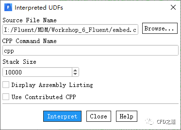 添加UDF源文件embed.c,点击按钮Interpret解释UDF