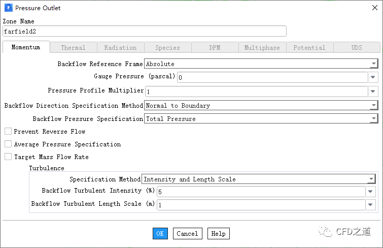 右键选择模型树节点Boundary Conditions > farfield2,点击弹出菜单项Type → pressure-outlet,弹出参数设置对话框 -