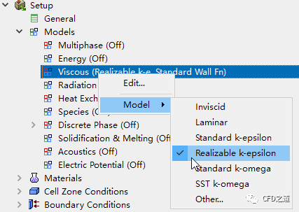 右键选择模型树节点Models > Viscous,点击弹出菜单项Model → Realizable k-epsilon启用湍流模型