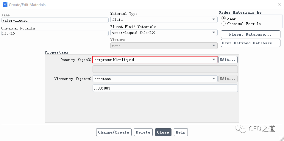 添加介质water-liquid,指定其密度为compressible-liquid
