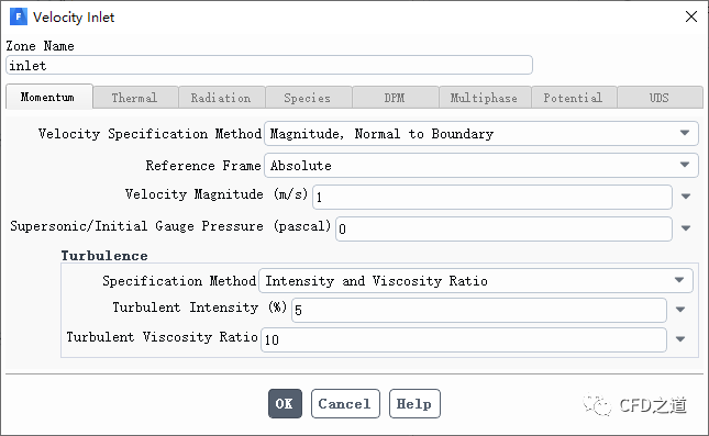 指定入口边界inlet的速度为1 m/s