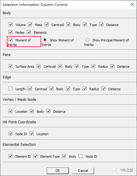 弹出对话框中选中选项Moment of Inertia,点击OK按钮