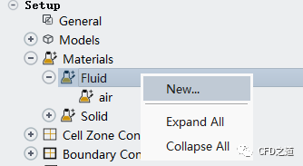 右键选择模型树节点Materials > Fluid,点击弹出菜单项New...打开材料新建对话框