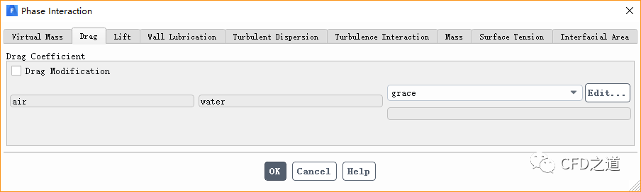 鼠标双击模型树节点Models > Multiphase > Phase Interactions,弹出设置对话框,进入Drag标签页,设置模型为grace,如下图所示