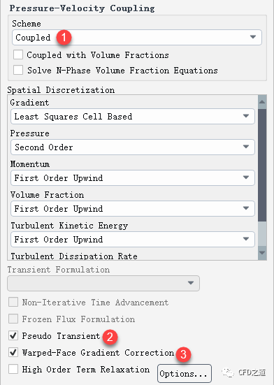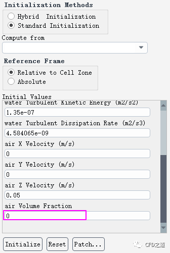 鼠标双击模型树节点Initialization,右侧面板选择选项呢Standard Initialization,设置air Volume Fraction为0,其他参数保持默认设置,点击按钮Initialize进行初始化
