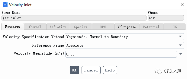 鼠标双击模型树节点Boundary Conditions > gas_inlet > air,弹出的对话框中设置入口速度为0.05 m/s
