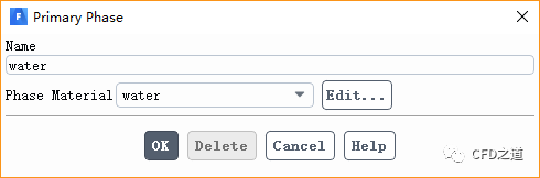 双击模型树节点Models > Multiphase(Mixture) > Phase > phase-1-Primary Phase,弹出主相设置对话框,设置Name为water,选择Phase Material为water,点击OK按钮关闭对话框