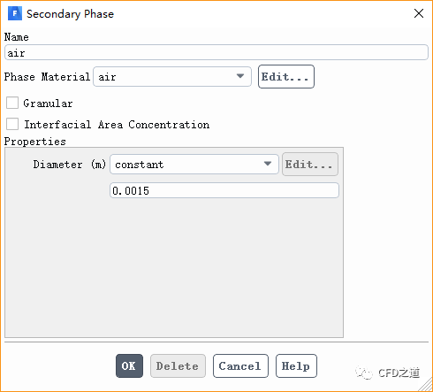 双击模型树节点Models > Multiphase(Mixture) > Phase > phase-2-Secondary-Phase,弹出第二相设置对话框,设置Name为air,选择Phase Material为air,设置Diameter为0.0015 m,其他参数保持默认设置,点击OK按钮关闭对话框