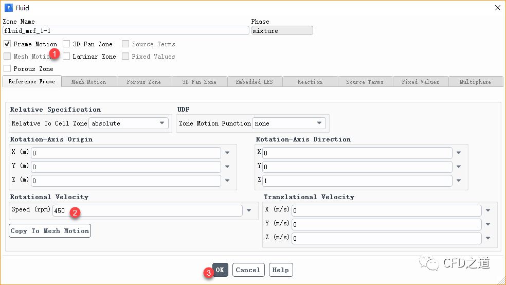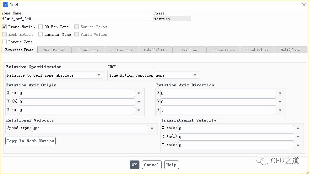 鼠标双击模型树节点Cell Zones Conditions > fluid_mrf_2-0,弹出区域设置对话框,如下图所示设置其旋转速度为450 rpm