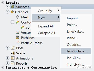 右键选择模型树节点Results > Surfaces,点击弹出菜单项New → Iso-Surface…创建等值面