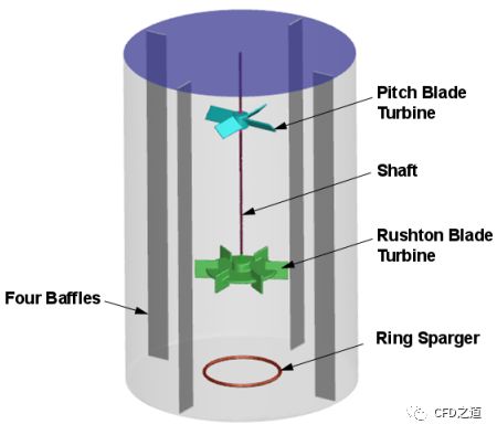 本案例计算模型如图所示。混合器包含四个挡板、一个环形喷雾器、一个斜叶浆,一个拉什顿桨以及一个旋转轴。顶部边界为Degassing边界,只允许气体流出。空气通过底部的环形喷雾器以0.05 m/s的速度注入搅拌器。案例忽略喷雾器环上的小孔,而将进气道建模为均匀的圆形带。Rushton涡轮叶片搅动气水混合物,使气泡均匀分布,斜叶桨执行扩散和泵送操作。两个叶轮均以450转/分的转速绕Z轴逆时针旋转(从顶部看)。