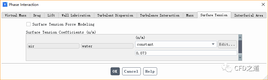 切换至Surface Tension标签页,设置表面张力系数为0.073 n/m,如下图所示